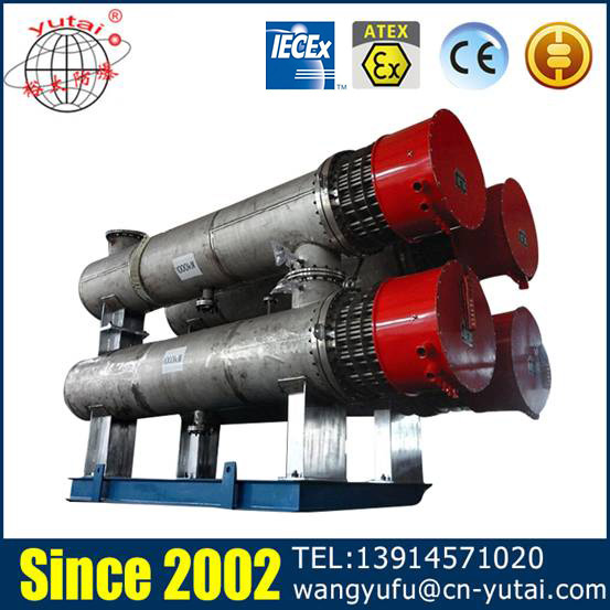 玉米油防爆電加熱器由4臺防爆電加熱器串聯組成,由于玉米油特殊的物理特性,加熱后容器結焦,所以需嚴格控制加熱密度和電熱管表面溫度。我們采用4臺串聯的方式有效降低了電加熱管加熱密度,保證玉米油不結焦。